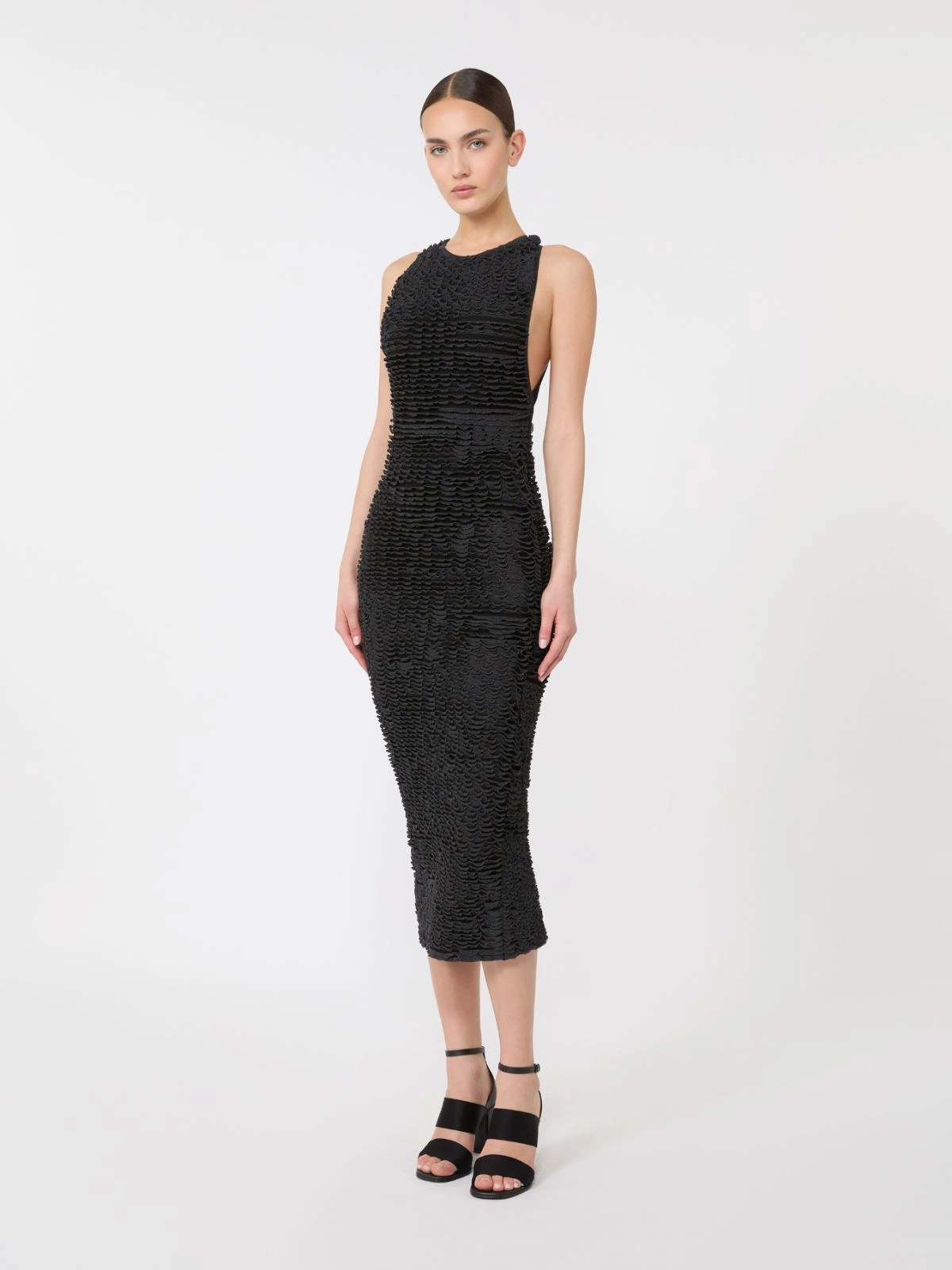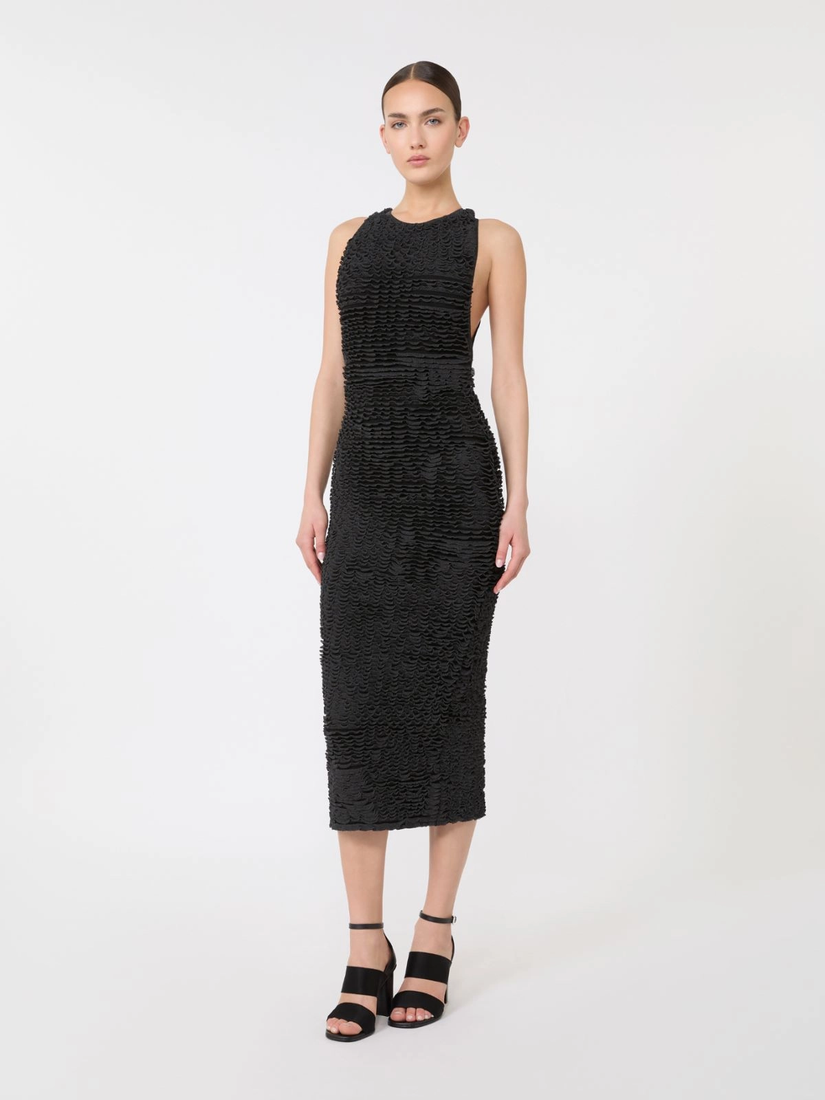 Long sleeveless dress, featuring an open back framed by elasticated ribbon shoulder straps.