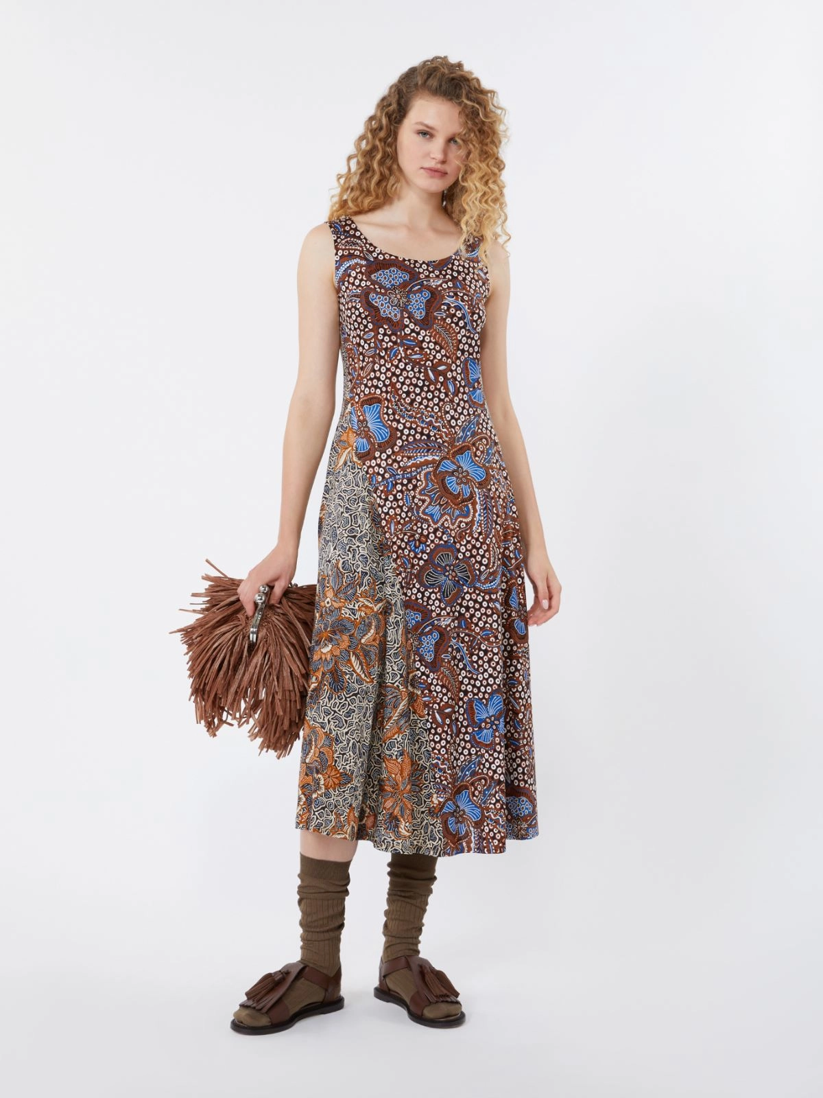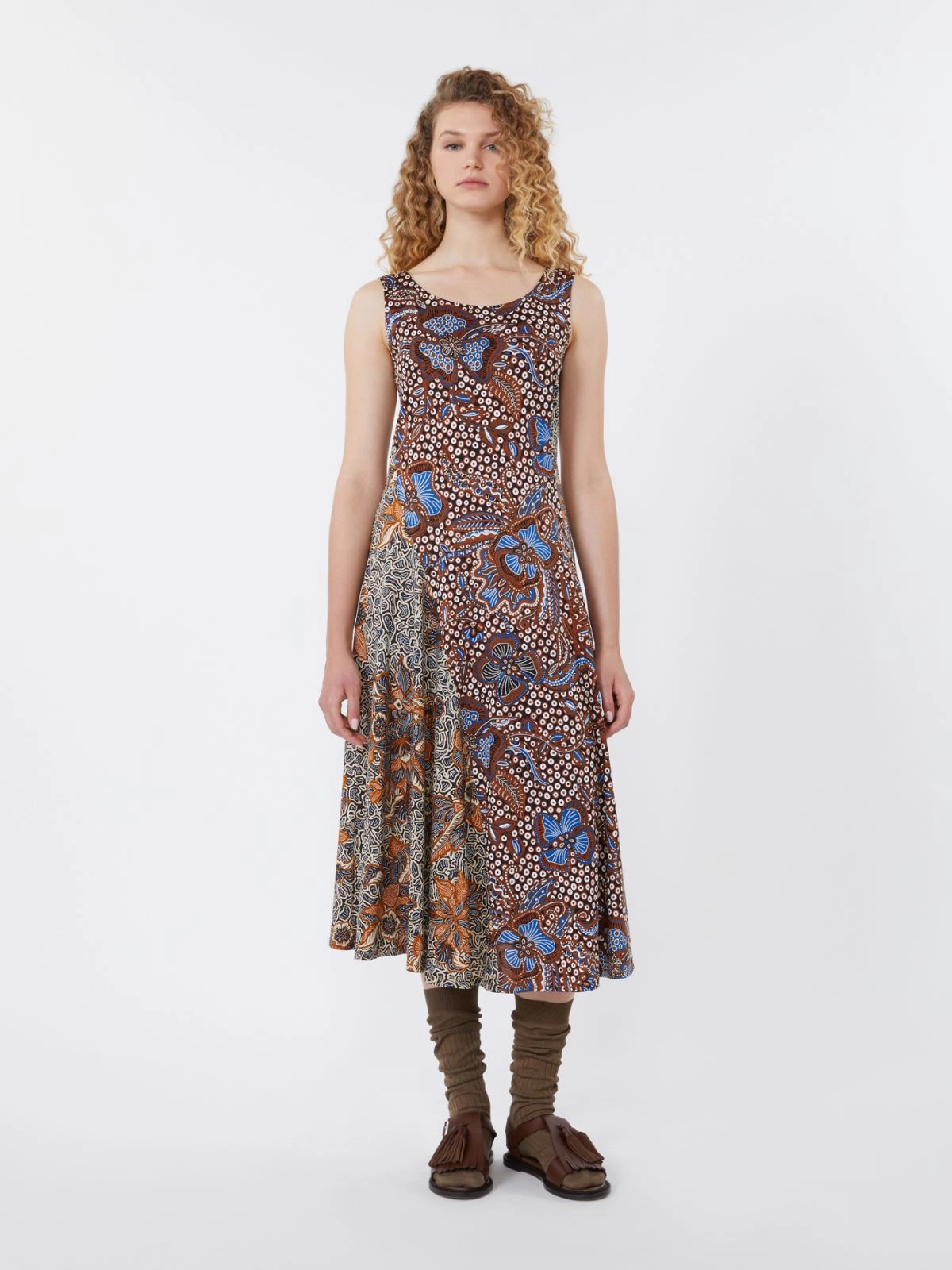 Flared midi dress featuring patchwork prints and diagonal seams that add movement.